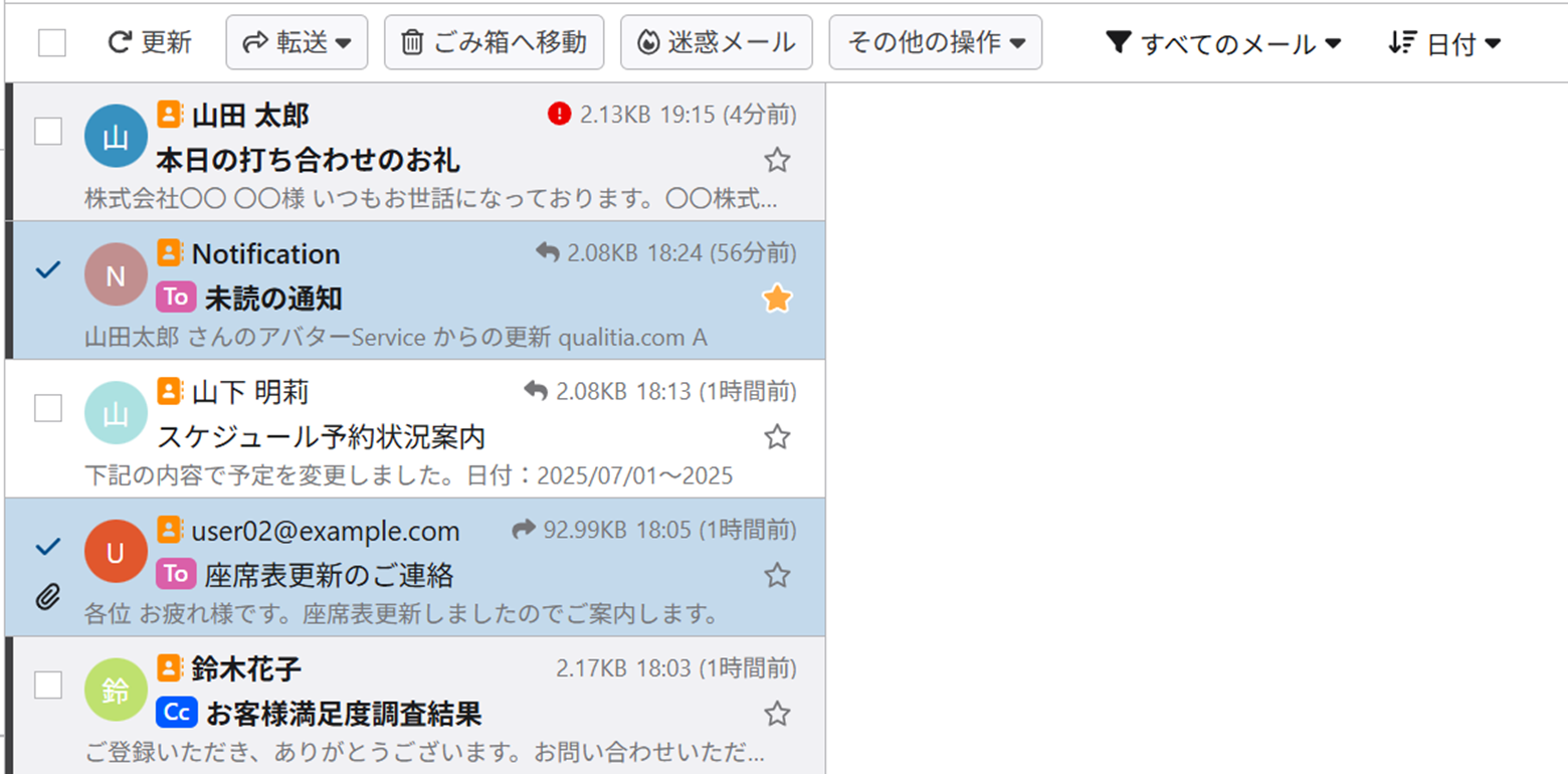 メール一覧は、フォルダー内のメールをリスト表示します。メール数が多い場合はページ分割して表示されます。